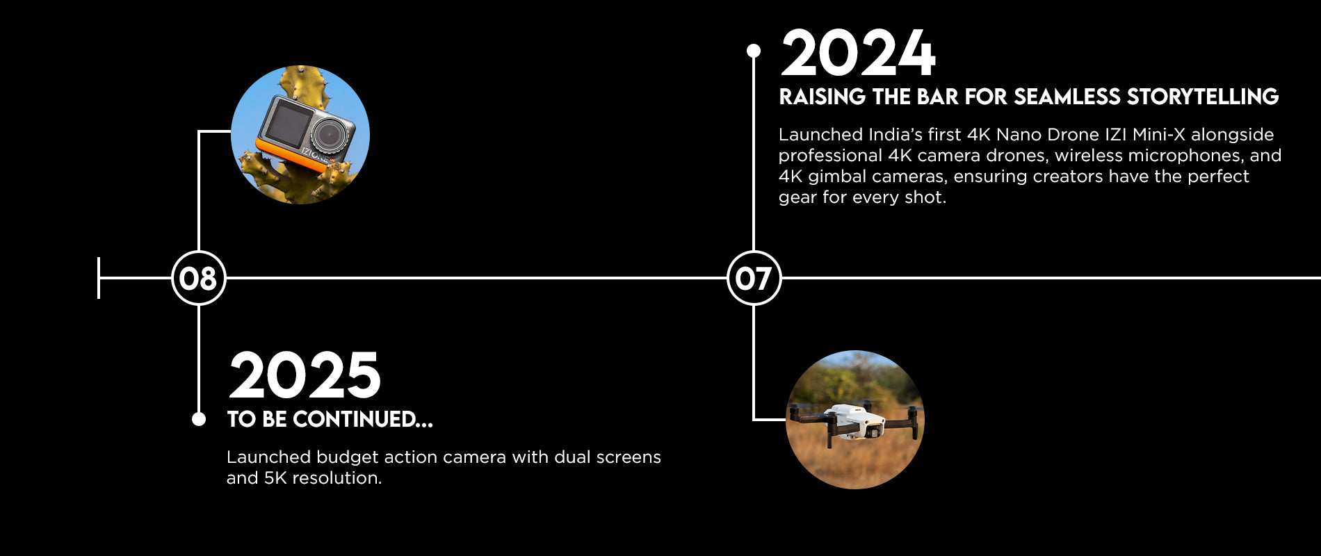 IZI isn’t just about gadgets—it’s about making high-quality filmmaking effortless for everyone. Whether you're soaring with a drone, capturing action-packed adventures, or vlogging on the go, our technology seamlessly integrates into your lifestyle. We empower you to capture, create, and relive your best moments—seamlessly and beautifully.