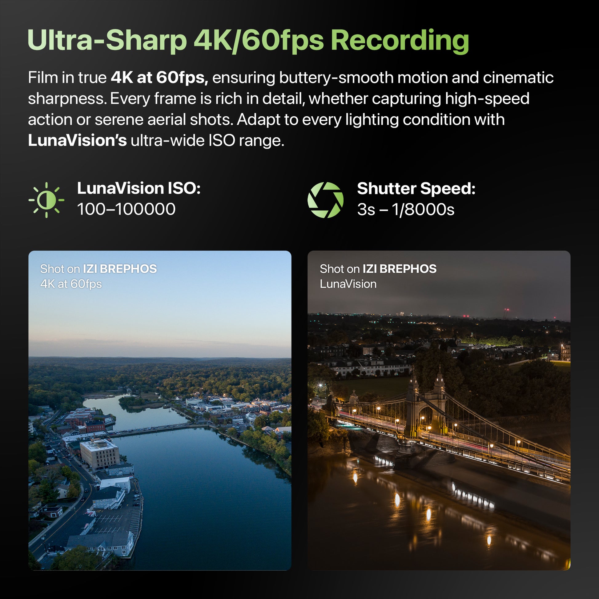 NightSight Ultra Mode: Achieve crisp, vibrant low-light footage with ISO 100–100000 sensitivity, perfect for night aerials and cityscapes.