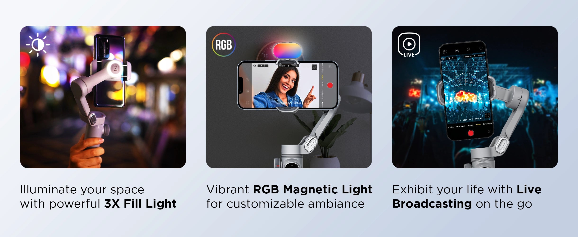 RGB Magnetic Fill Light: 16 colors, magnetic attachment, and 3-fill light for enhanced shots.