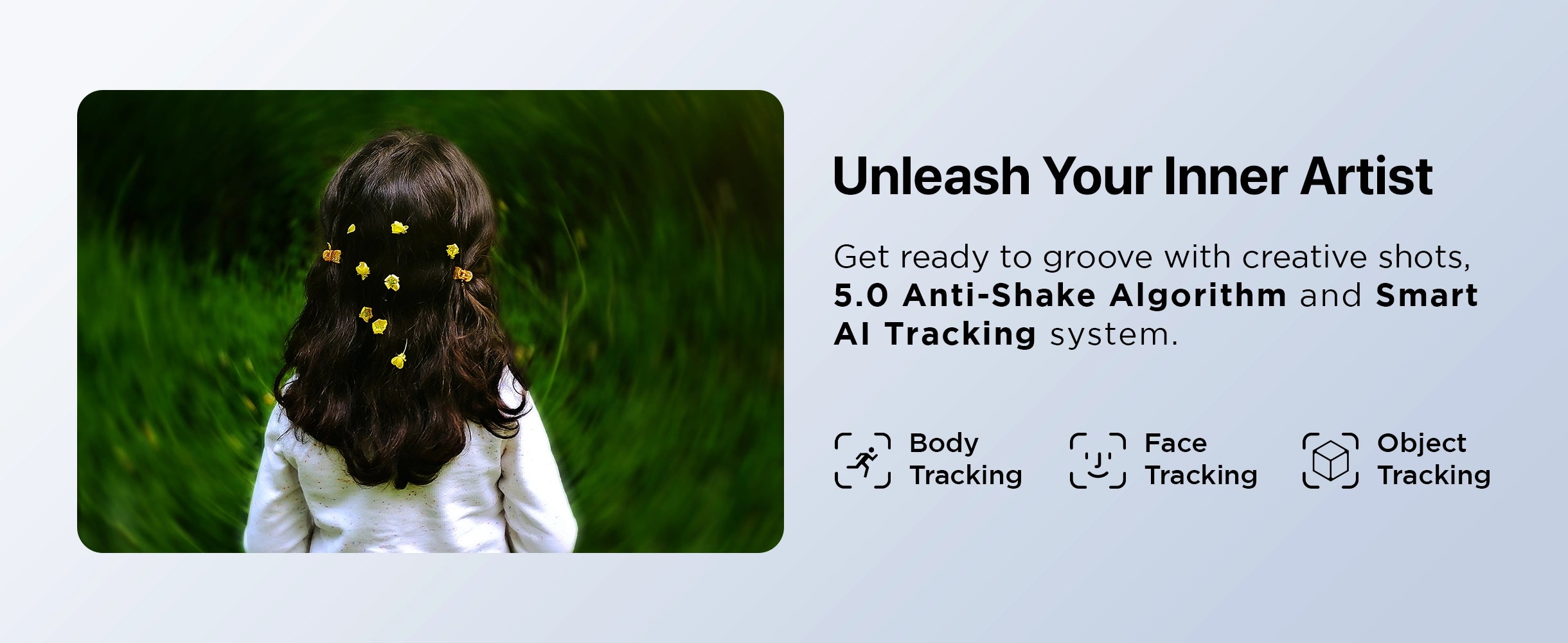 Smart AI Modes: Face Track, Time-Lapse, Slow Motion, and more for pro-level filming.